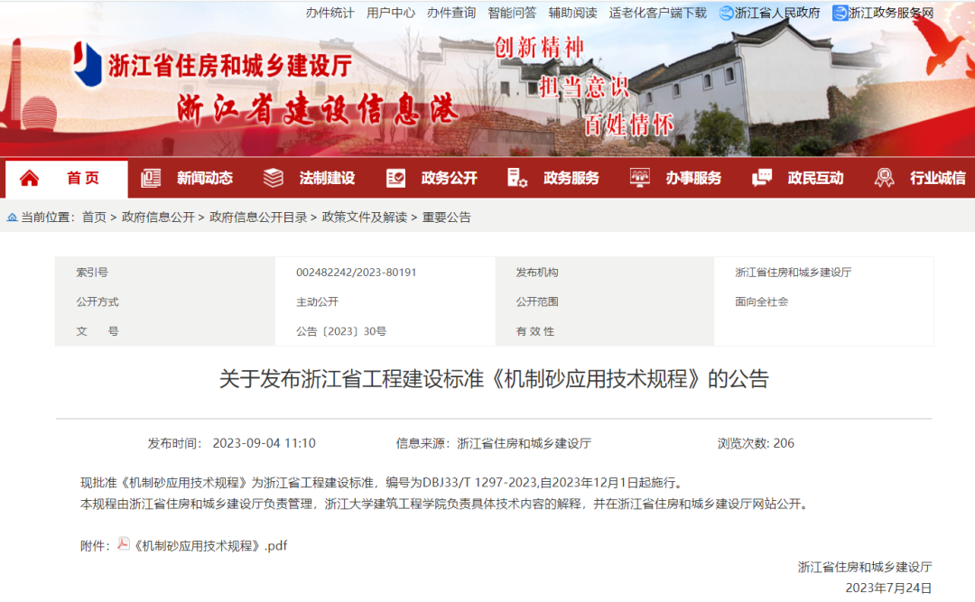 近日,浙江省住房和城鄉建設廳發布工程建設標準《機制砂應用技術規程》(以下簡稱《技術規程》),本規程共分為5章2個附錄。主要內容包括:總則,術語和符號,機制砂質量要求,機制砂混凝土,機制砂砂漿。主編單位為浙江大學建筑工程學院、浙江交通資源投資集團有限公司和海建設科技集團有限公司。