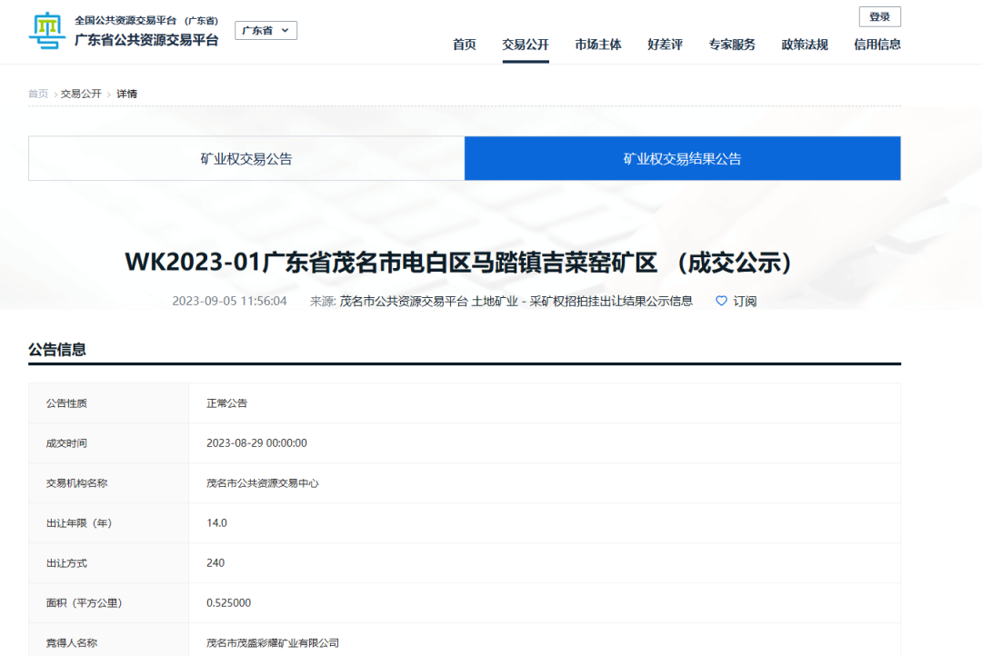 競得人:茂名市茂盛彩耀礦業有限公司