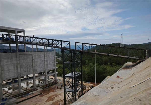 皮帶機(jī)棧橋總長(zhǎng)超2000米,總體重量超1600噸。本次吊裝的兩跨棧橋鋼桁架寬6米,高3米,長(zhǎng)度達(dá)到50.35米,重量達(dá)39.99噸,是項(xiàng)目整條砂石骨料加工運(yùn)輸線單次吊裝噸位最大的棧橋,主要承擔(dān)成品骨料外轉(zhuǎn)運(yùn)輸工作。
