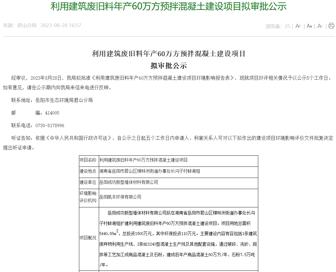 9月5日,岳陽市生態環境局君山分局發布了關于《利用建筑廢舊料年產60萬方預拌混凝土建設