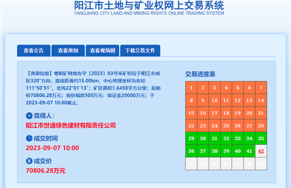 9月7日,陽江市世通綠色建材有限責任公司以底價70806.28萬元(約7.1億元)競得廣東省陽江市陽東區紅五月十隊鍋蓋嶺礦區建筑用花崗巖礦、角巖礦采礦權。該礦資源儲量7186.58萬方,生產規模300萬方/年,出讓23.5年。另外,競得人還需額外支付8.96億元(近9億元)相關費用。