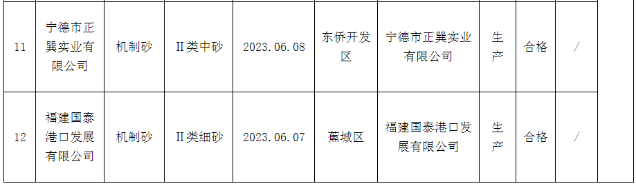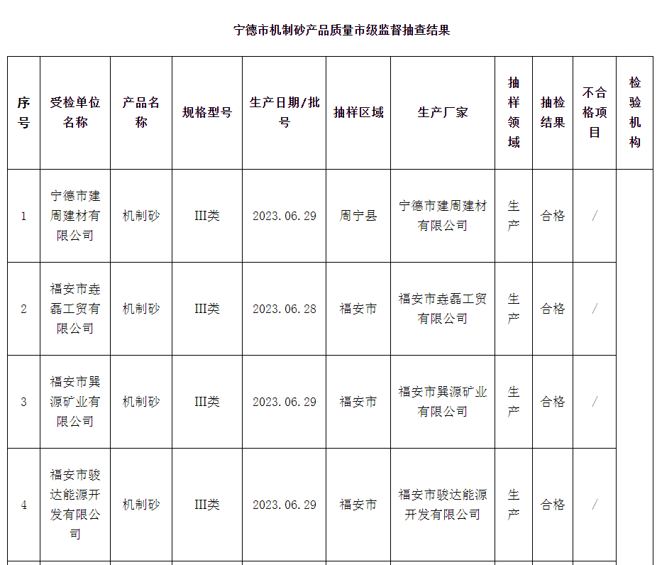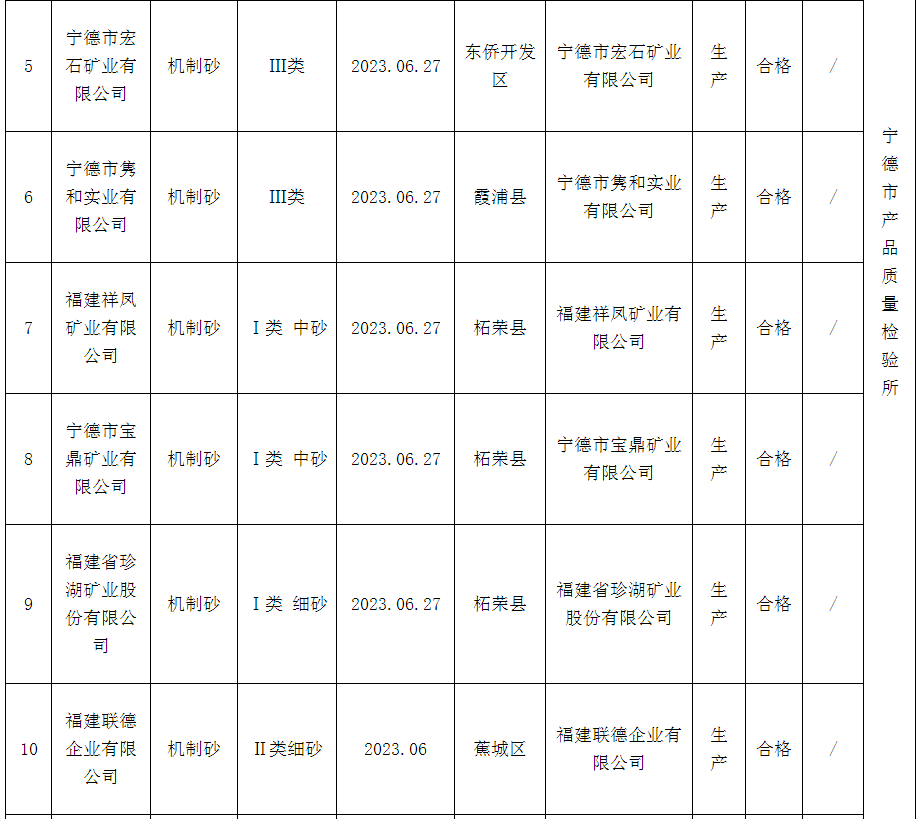 近日,福建省寧德市市場(chǎng)監(jiān)督管理局發(fā)布工業(yè)產(chǎn)品質(zhì)量市級(jí)監(jiān)督抽查質(zhì)量公告(2023年第4期)。本期該局對(duì)機(jī)制砂開展產(chǎn)品質(zhì)量市級(jí)監(jiān)督抽查,共抽查12家企業(yè)12批次產(chǎn)品,未發(fā)現(xiàn)不合格。