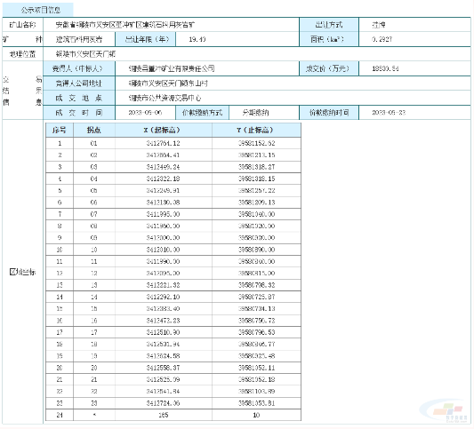 礦區建筑石料用灰巖礦采礦權成功出讓,擬出讓19.4年,年產300萬噸,掛牌起始價18430.54萬元,銅陵縣董沖礦業有限責任公司以18530.54萬元拿下。
