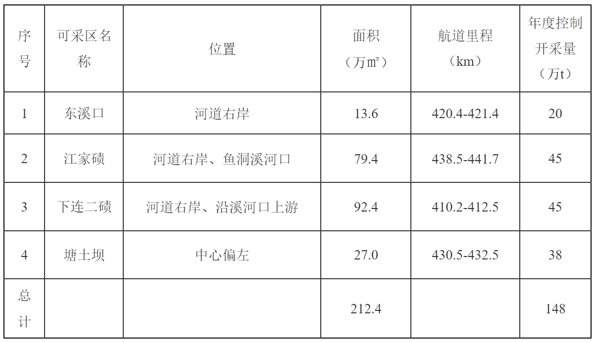 2023年采砂開采區域為長江干流忠縣段東溪口、江家磧、下連二磧、塘土壩,本年度開采控制總量為148萬噸。