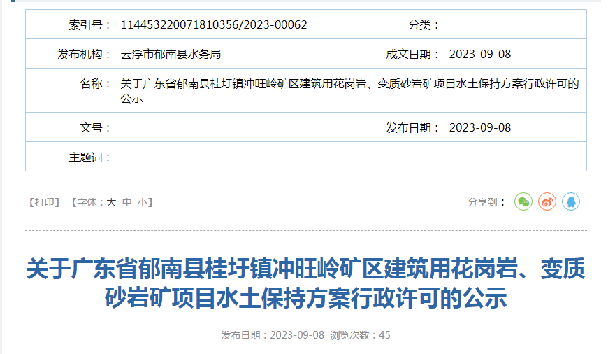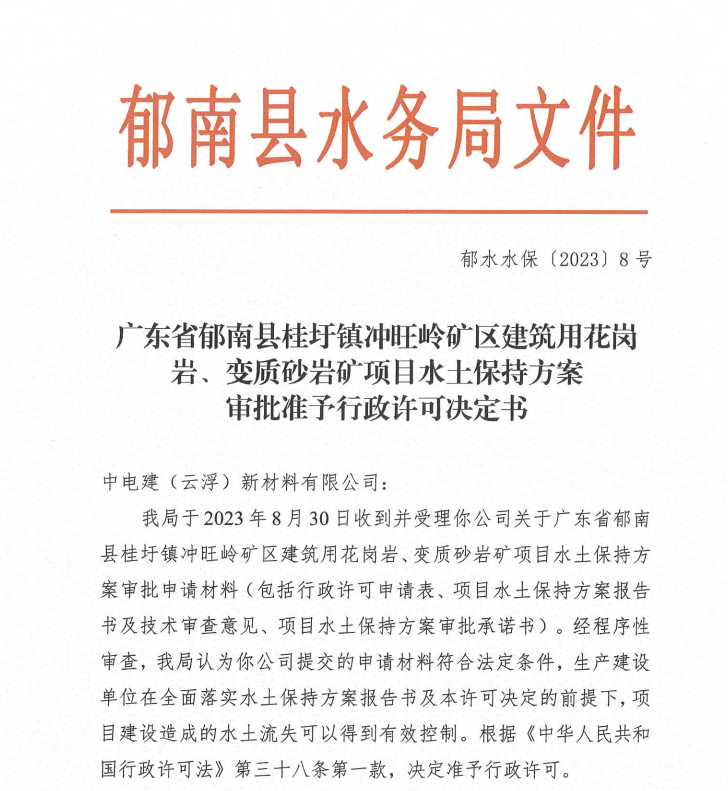近日,廣東省郁南縣水務局對廣東省郁南縣桂圩鎮沖旺嶺礦區建筑用花崗巖、變質砂巖礦項目水土保持方案作出準予行政許可決定。