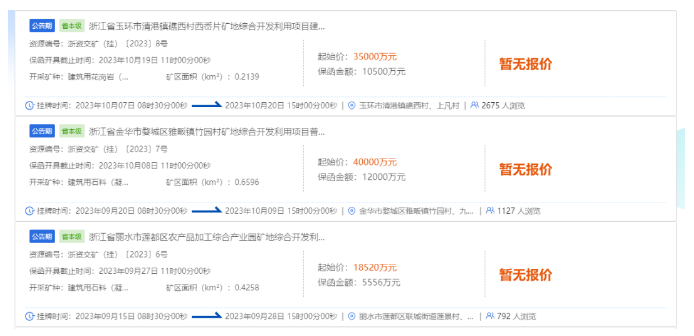 據悉,浙江2023年成功出讓12宗采礦權。同時,浙江省當前新成交礦山大多為“項目類采礦權”,主要包含礦地綜合開發利用項目、廢棄礦區生態修復項目等,出讓年限相對較短但開采規模較大,起拍金額也較高。