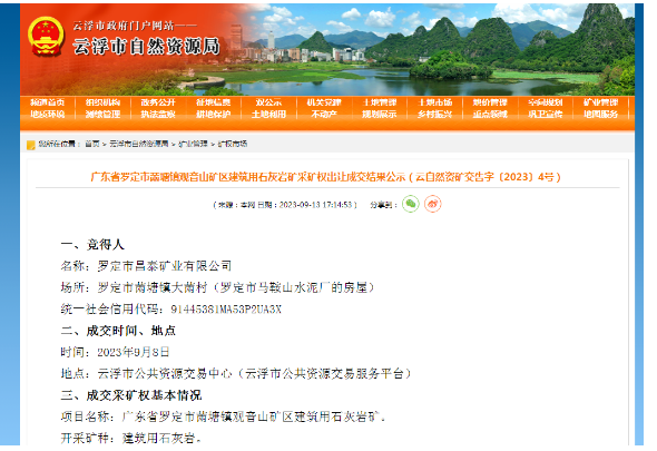 成交價7432萬元,廣東羅定一宗建筑用石灰巖礦成功出讓!