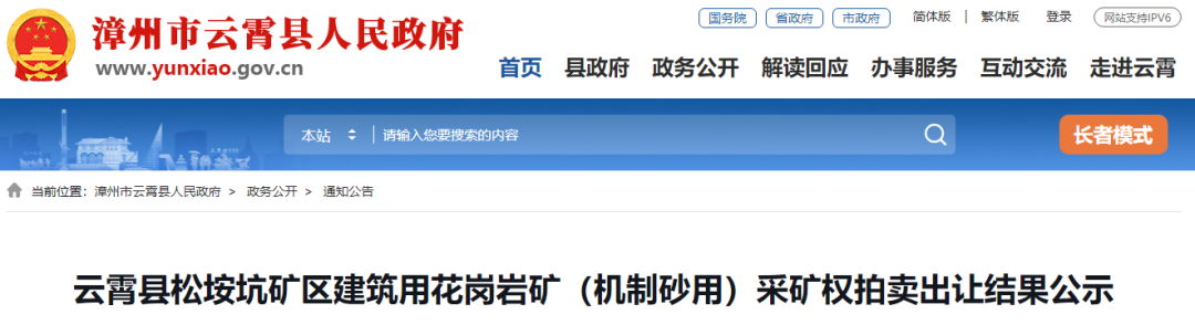 云霄縣松垵坑礦區建筑用花崗巖礦(機制砂用)采礦權拍賣出讓結果公示經云霄縣人民政府批準,云霄縣自然資源局于2023年9月6日,在云霄縣公共資源交易中心舉行云霄縣松垵坑礦區建筑用花崗巖礦(機制砂用)采礦權拍賣活動。現將拍賣結果公示如下: