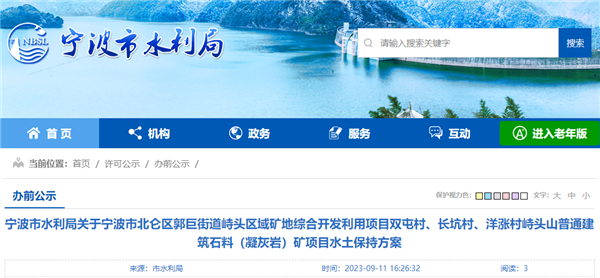 9月11日,浙江省寧波市水利局發布寧波市北侖區郭巨街道峙頭區域礦地綜合開發利用項目雙屯村、長坑村、洋漲村峙頭山普通建筑石料(凝灰巖)礦項目水土保持方案報告書擬審批公示。該項目總投資26億元,年生產規模1020萬噸,計劃2023年10月開工,2027年9月完工,總工期48個月。建設單位寧波浙青礦業有限公司,為國有企業。