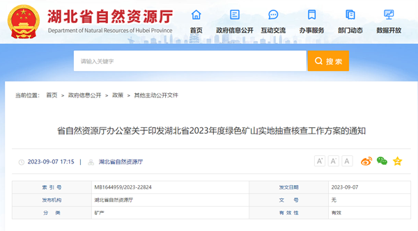 湖北省自然資源廳發布《湖北省2023年度綠色礦山實地抽查核查工作方案》。《方案》明確,省廳負責組織、聯合相關市縣自然資源主管部門對24宗已納入國家綠色礦山名錄和3宗已納入省級綠色礦山儲備庫的礦山開展實地抽查核查;市級自然資源主管部門負責對納入市級綠色礦山儲備庫,以及通過第三方評估的綠色礦山開展實地抽查核查,核查比例不低于20%。