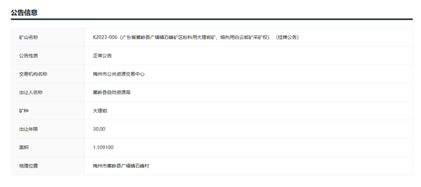 廣東省梅州市蕉嶺縣廣福鎮石峰礦區粉料用大理巖礦、熔劑用白云巖礦采礦權掛牌出讓。該礦資源儲量9280.84萬方(約25058萬噸),年產能360萬方(約972萬噸),出讓年限30年,起拍價150000萬元(15億元)。出讓公告中并沒有明確該采礦權收益繳納方式是分期繳納還是一次性繳納。