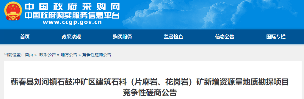 蘄春縣劉河鎮石鼓沖礦區建筑石料(片麻巖、花崗巖)礦新增資源量地質勘探項目競爭性磋商公告