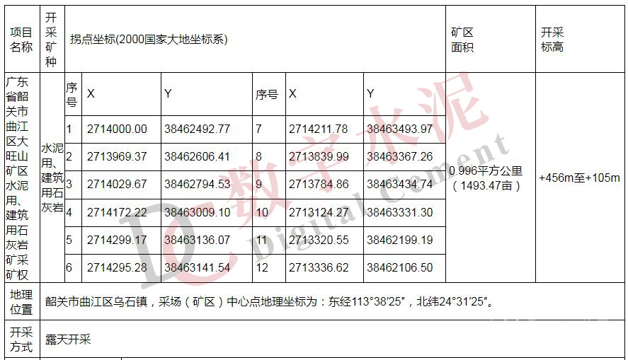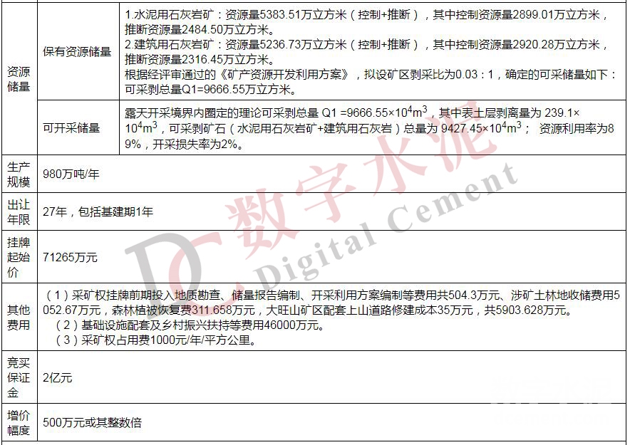 根據廣東省韶關市曲江區大旺山礦區水泥用、建筑用石灰巖礦采礦權掛牌出讓公告(交易序號:韶曲礦出讓字〔2023〕2號)顯示,根據《中華人民共和國礦產資源法》《礦業權出讓交易規則》《廣東省探礦權采礦權招標拍賣掛牌出讓管理辦法》等法律、法規和規章規定,韶關市曲江區自然資源局委托韶關市公共資源交易中心以網上掛牌方式公開出讓廣東省韶關市曲江區大旺山礦區水泥用、建筑用石灰巖礦采礦權。掛牌起始價為71265萬元,生產規模為980萬噸/年。詳情如下: