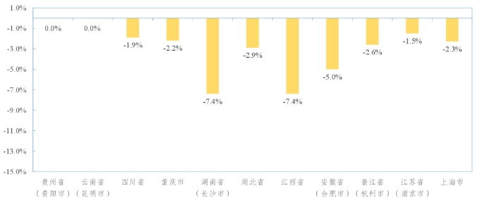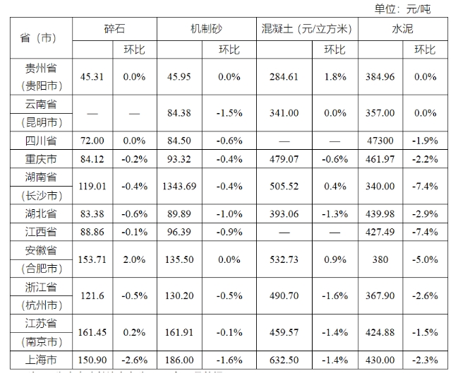 機(jī)制砂持續(xù)下跌,跌幅整體呈中上游擴(kuò)大、下游收窄趨勢。其中,中上游的云南省(昆明市)、重慶市、湖南省(長沙市)、湖北省、江西省跌幅擴(kuò)大,四川省跌幅收窄1.1個百分點(diǎn),貴州省(貴陽市)與上月持平;下游浙江省(杭州市)、江蘇省(南京市)跌幅分別收窄0.7、2.1個百分點(diǎn),安徽省(合肥市)止跌企穩(wěn),上海市持續(xù)下跌、跌幅與上月持平。