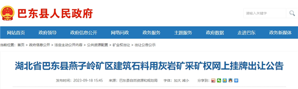 近日,湖北省恩施巴東縣自然資源和規劃局發布巴東縣燕子嶺礦區建筑石料用灰巖礦采礦權掛牌出讓公告。該礦保有資源儲量4125.11萬方(合11096.5萬噸),生產規模900萬噸/年,出讓年限14年(采礦期12年、基建期2年),起始價1.3億元,噸成本約1.17元。掛牌時間2023年10月20日-2023年11月2日。