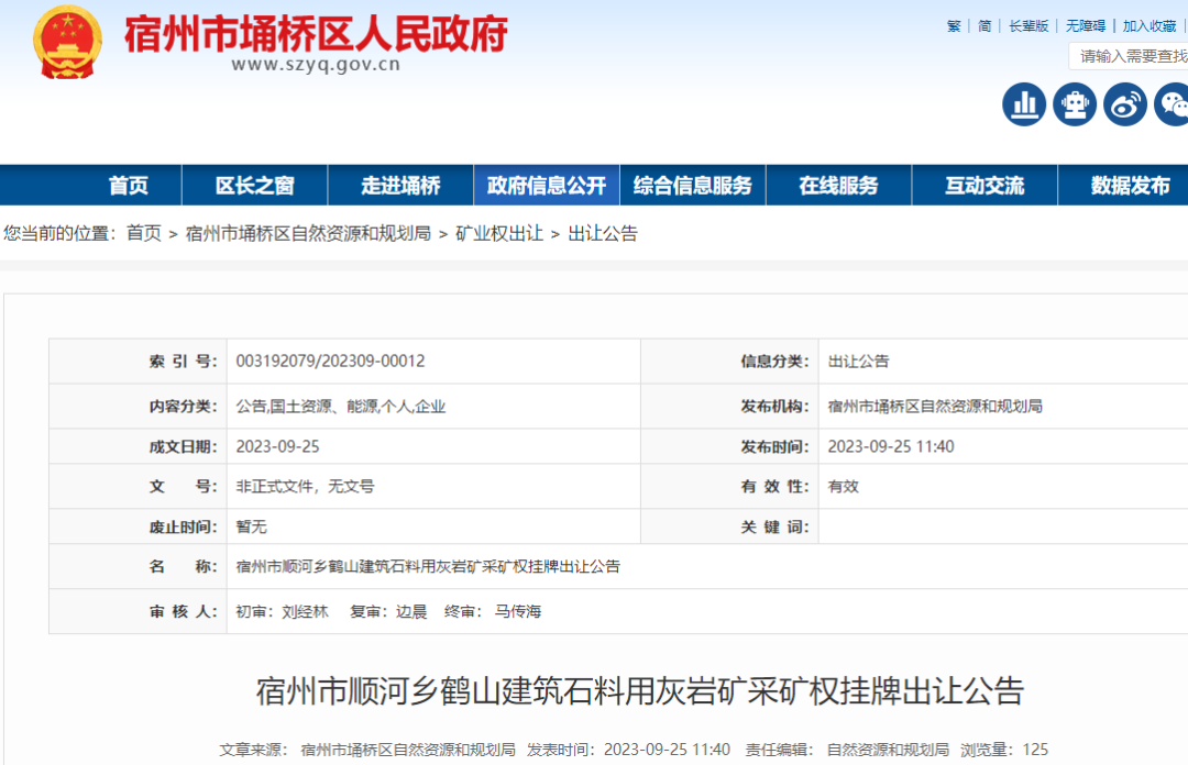 宿州市順河鄉鶴山建筑石料用灰巖礦采礦權掛牌出讓公告