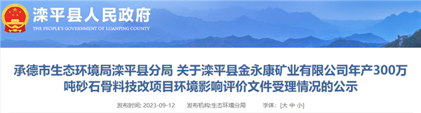 近日,河北省承德市生態(tài)環(huán)境局灤平分局發(fā)布灤平縣金永康礦業(yè)有限公司年產(chǎn)300萬噸砂石骨料技改項目環(huán)評公示。該項目總投資2850萬元,計劃年處理廢石375萬噸,年產(chǎn)砂石骨料300萬噸。施工工期2個月。