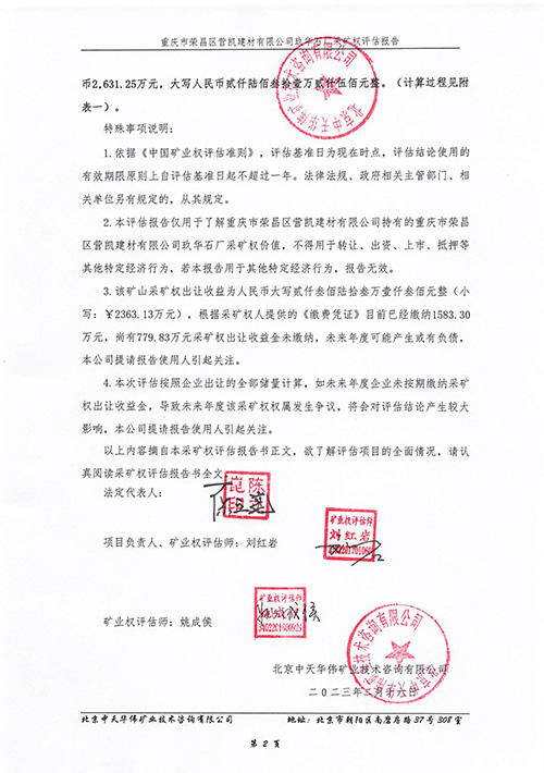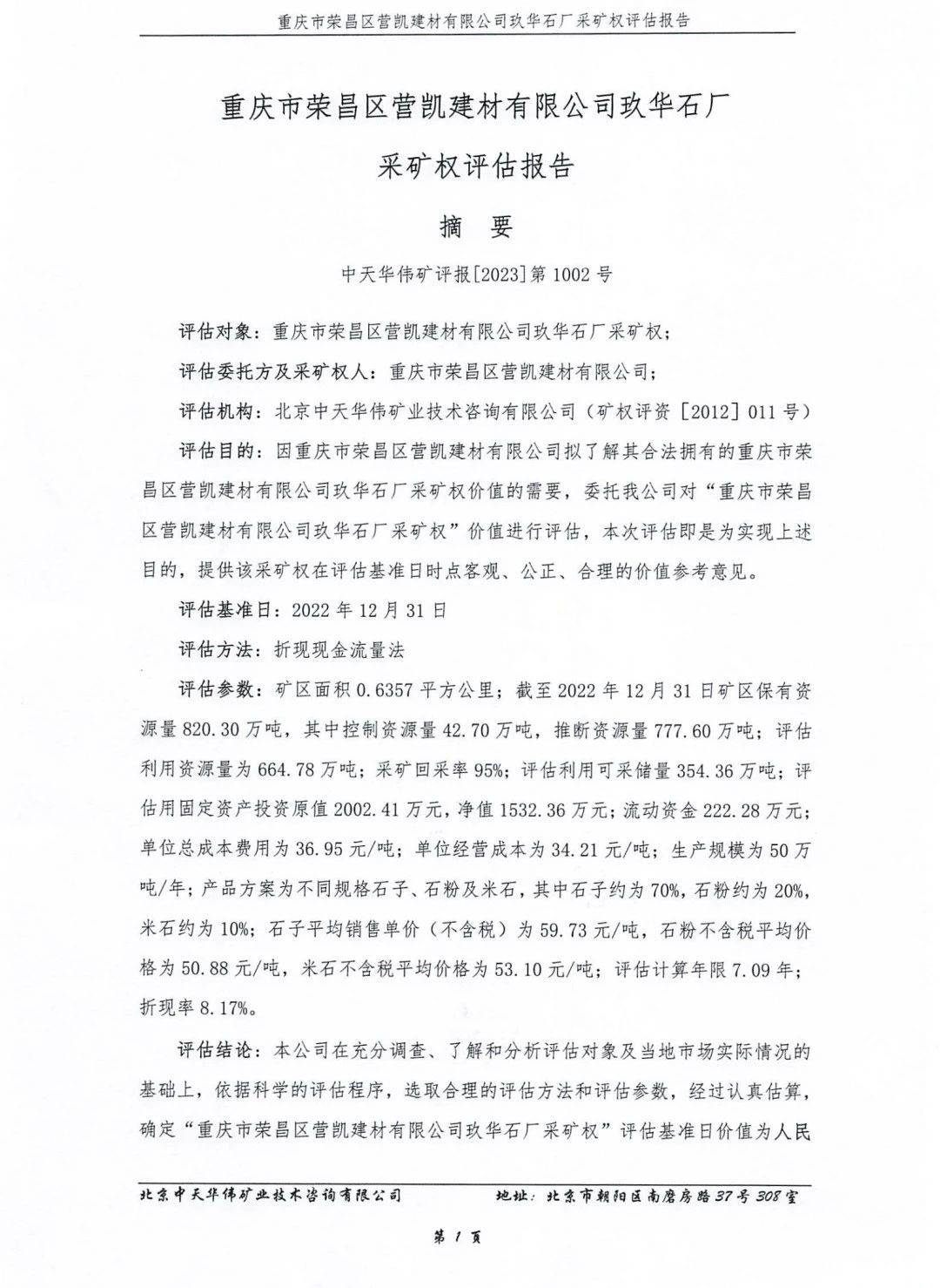 重慶市榮昌區營凱建材有限公司玖華石廠出讓,出讓內容包括玖華石廠全部股權及全部固定資產,包括采礦權、廠區房屋、設備、庫存、已建成工程等;采礦權剩余期限為自采礦權轉讓日起至到期日2029年8月13日,可以再延長至礦產完全開采完畢;生產規模50萬噸/年,截止2022年底,礦區范圍內保有建筑石料用灰巖資源量820.3萬噸,其中控制資源量42.7萬噸,推斷資源量777.6萬噸。