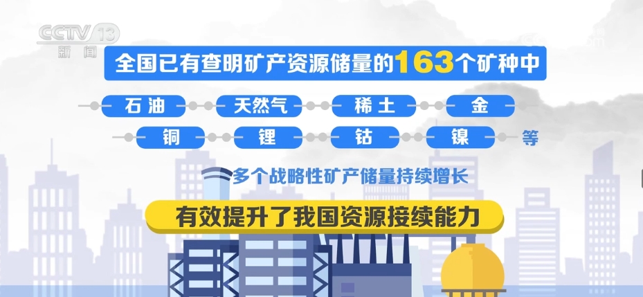 數據顯示,全國已有查明礦產資源儲量的163個礦種中,石油、天然氣、稀土、金、銅、鋰、鈷、鎳等多個戰略性礦產儲量持續增長,有效提升了我國資源接續能力。