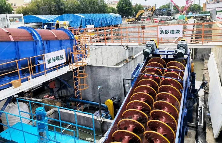該生產(chǎn)線主要由篩分模塊、洗砂模塊、絮凝模塊、壓濾模塊、流體系統(tǒng)及電氣控制系統(tǒng)設(shè)備等模塊組成,每天可處置1200-1400立方米盾構(gòu)渣土。