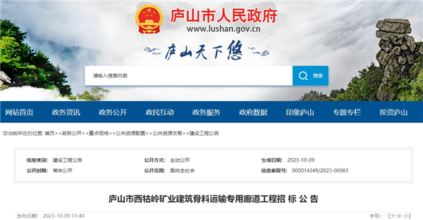 10月9日,江西省九江市廬山市人民政府發布廬山市西牯嶺礦業建筑骨料運輸專用廊道工程招標公告。主要建設綠色環保砂石骨料運輸廊道一條,建成后年輸送量2500萬噸,計劃投資10億元。總工期240日歷天,計劃2023年11月開工,2024年7月完工。