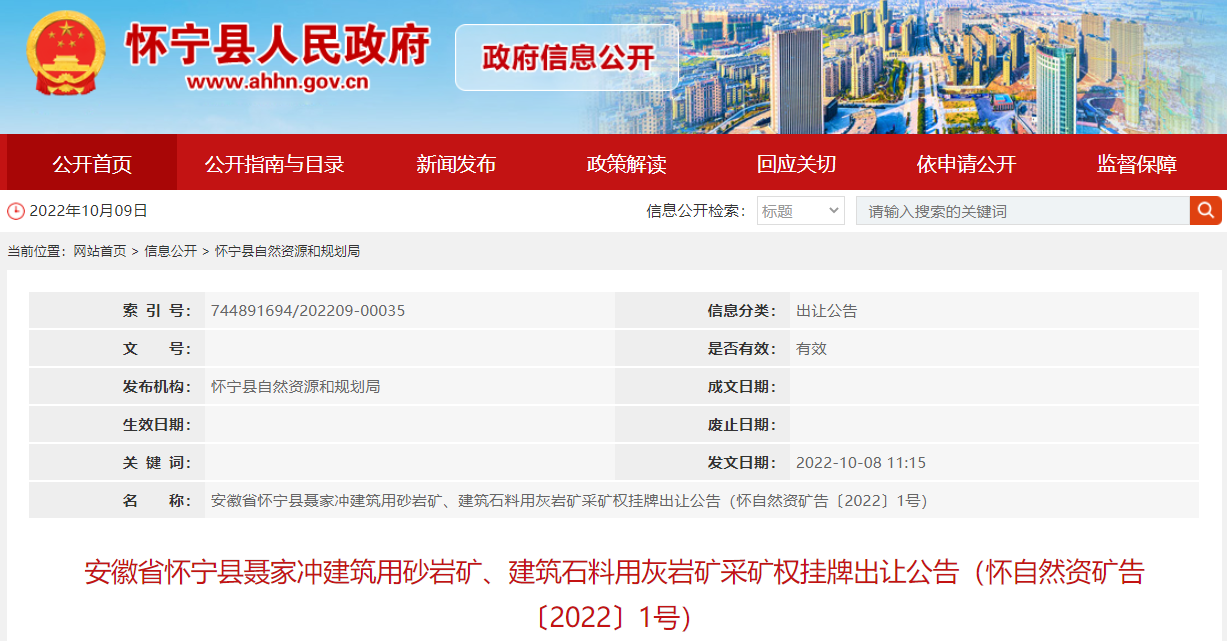 2022年10月,安徽省懷寧縣出讓此處建筑用砂巖礦、建筑石料用灰巖礦采礦權;