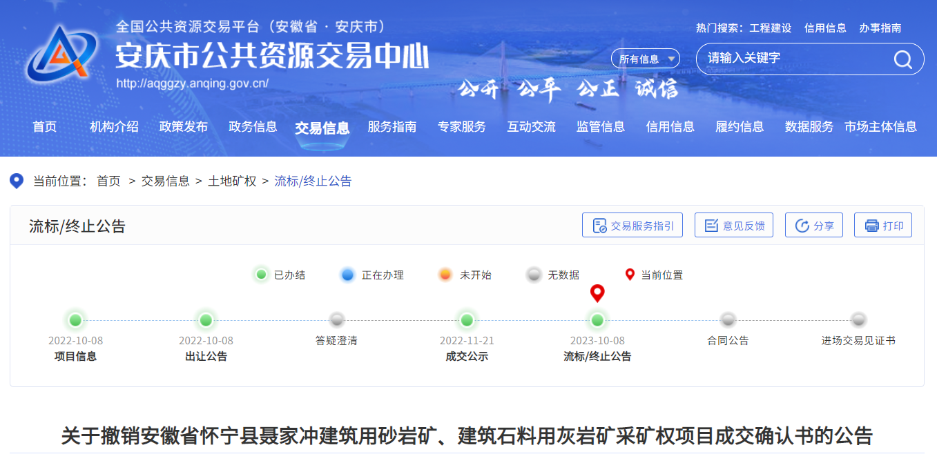 2023年10月8日,安徽安慶市公共資源交易平臺發布撤銷安徽省懷寧縣聶家沖建筑用砂巖礦、建筑石料用灰巖礦采礦權項目成交確認書的公告。