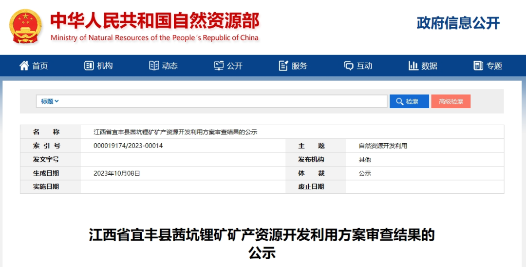 10月9日,自然資源部官網發布消息,江西省宜豐縣茜坑鋰礦礦產資源開發利用方案通過審查并進行公示。
