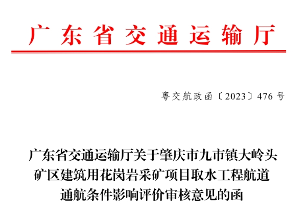 廣東省交通運輸廳關于肇慶市九市鎮(zhèn)大嶺頭礦區(qū)建筑用花崗巖采礦項目取水工程航道通航條件影響評價審核意見的函粵交航政函