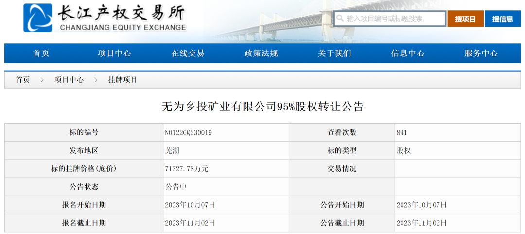 近日,安徽無為鄉村振興投資有限公司擬公開轉讓持有的無為鄉投礦業有限公司95%股權,掛牌價格(底價)71327.78萬元 。安徽無為鄉村振興投資有限公司擬公開轉讓持有的無為鄉投礦業有限公司95%股權,掛牌價格(底價)71327.78萬元 。