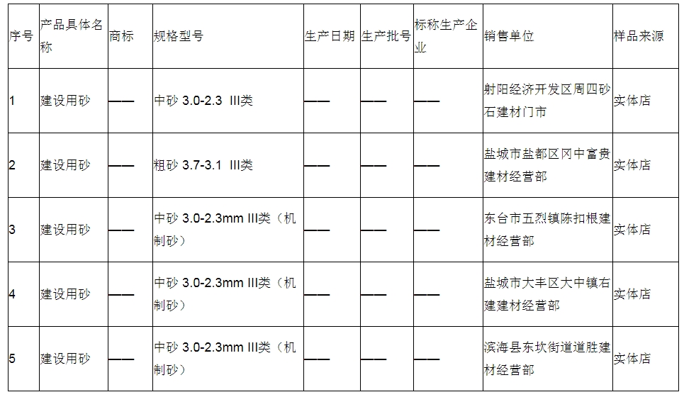 2023年度鹽城市市場監(jiān)督管理局委托鹽城市產(chǎn)品質(zhì)量監(jiān)督檢驗所組織實施建設用砂產(chǎn)品市級監(jiān)督抽查。本次抽查計劃5批次,抽到5批次,經(jīng)檢驗合格5批次。
