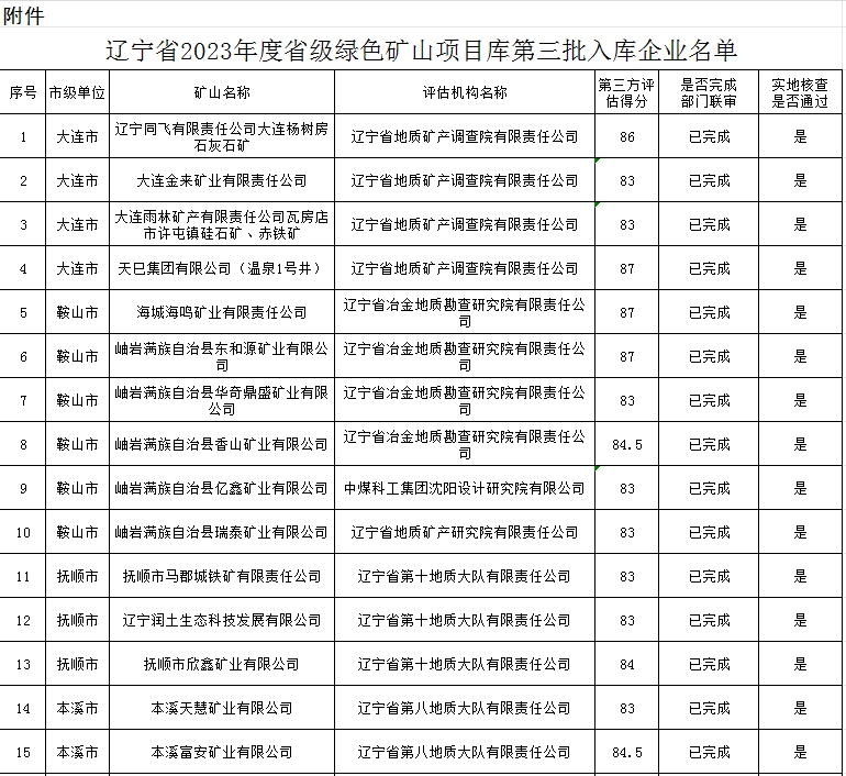 10月19日,遼寧省自然資源廳發布《遼寧省2023年度省級綠色礦山項目庫第三批入庫企業名單公告》。