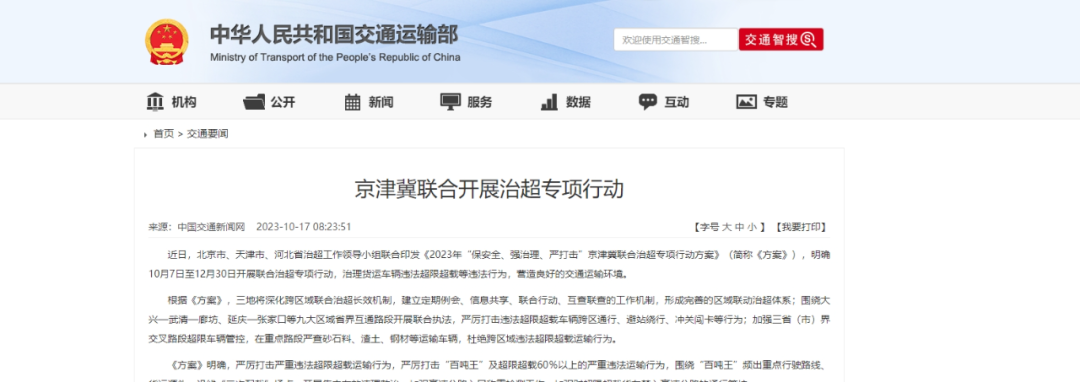 近日,北京市、天津市、河北省治超工作領導小組聯合印發《2023年“保安全、強治理、嚴打擊”京津冀聯合治超專項行動方案》,從10月7日至12月30日,三地將進行為期近3個月的聯合治超專項行動。具體情況如下: