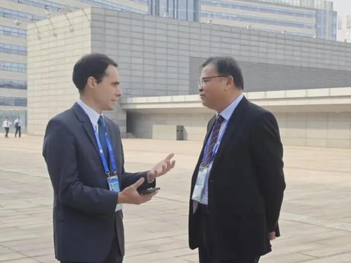 華新水泥股份有限公司總裁李葉青(右)與巴西InterCement集團代表馬爾科交流。蔡雅思 攝