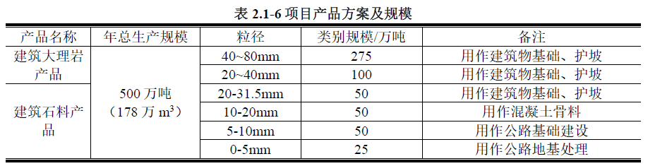 建筑用大理巖礦石,采礦規(guī)模為500萬t/a,共計服務(wù)年限為15年。通過碎石機將礦石加工成粒徑分別為40~80mm、20~40mm 兩種建筑大理巖產(chǎn)品和 20~31.5mm、10~20mm、5~10mm 和0~5mm四種建筑石料產(chǎn)品。