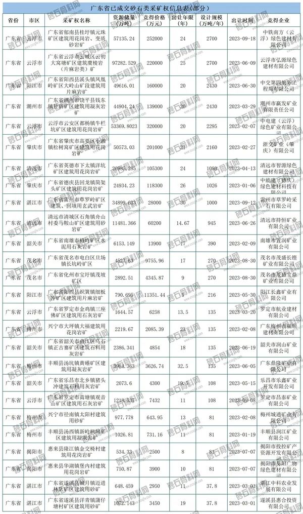 2023年10月14日,廣東肇慶市公共資源交易平臺發布德慶縣九市鎮大車嶺頭礦區(二區)建筑用花崗巖礦采礦權出讓公告。礦區范圍內累計查明建筑用花崗巖礦資源量礦石量13373.27萬方,歷年開采動用(消耗)探明資源量礦石量156.67萬方,保有資源量礦石量13216.6萬方,生產規模480萬方/年,出讓年限24.5年(含基建期2年、閉坑治理區1年),起始價13.2億元,掛牌時間為2023年11月11日至2023年11月24日。