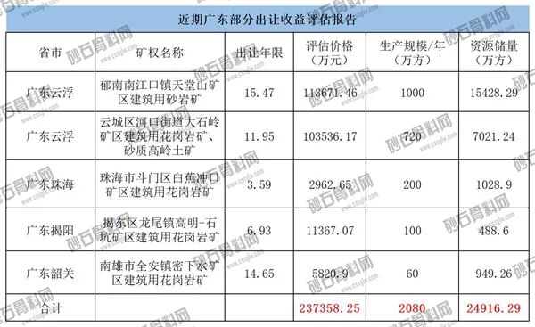 據不完全統計,2023年10月9-19日,廣東地區又有5宗砂石礦發布出讓收益評估報告,合計評估收益約24億元,年生產規模2080萬方,資源儲量約2.5億方(下附具體礦權信息)。其中,年產最高的為廣東云浮郁南縣南江口鎮天堂山礦區建筑用砂巖礦,評估利用年生產規模1000萬方;年產最低的為廣東南雄市全安鎮密下水礦區建筑用花崗巖礦,評估利用年生產規模60萬方。