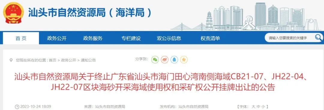 2023年10月24日,廣東省汕頭市自然資源局發布終止汕頭市海門田心灣南側海域CB21-07、JH22-04、JH22-07區塊海砂開采海域使用權和采礦權公開掛牌出讓的公告。