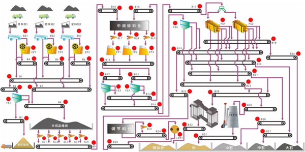 采用工廠化設計,將砂石破碎、篩分、整形、制砂、選粉等工藝高效集成,采用智能PLC控制系統,做到“一鍵開機”,操作便捷,利用高新感應設施及智能視頻系統,將現場生產情況實時反饋至控制室及相關操作人員,同時便于管理人員及時掌握現場情況,并進行生產調節,且提高了工作效率。