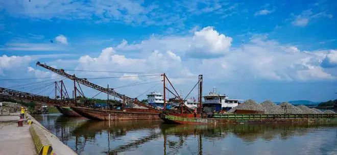 10月21日,在位于李渡鎮(zhèn)羊口村的羊口砂石基地,只見一艘艘砂石運輸船整齊有序地停靠在羊口碼頭,船上如小山般堆積的砂石正通過一條條輸送帶輸送至砂石加工廠原料倉。
