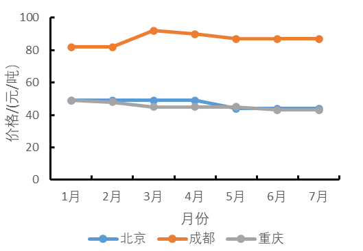 2023年1-7月代表性的地區(qū)的機(jī)制砂價(jià)格整體呈下降趨勢(shì)。