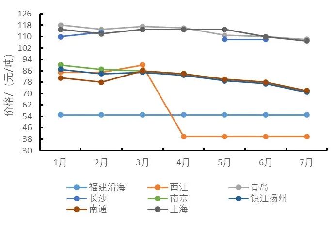 2023年沿海、港口地區(qū)1-7月機(jī)制砂價(jià)格變化趨勢(shì)