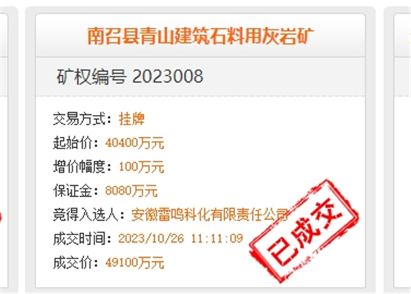 10月26日,安徽雷鳴科化有限責任公司以4.91億元競得河南省南陽市南召縣青山建筑石料用灰巖礦采礦權。