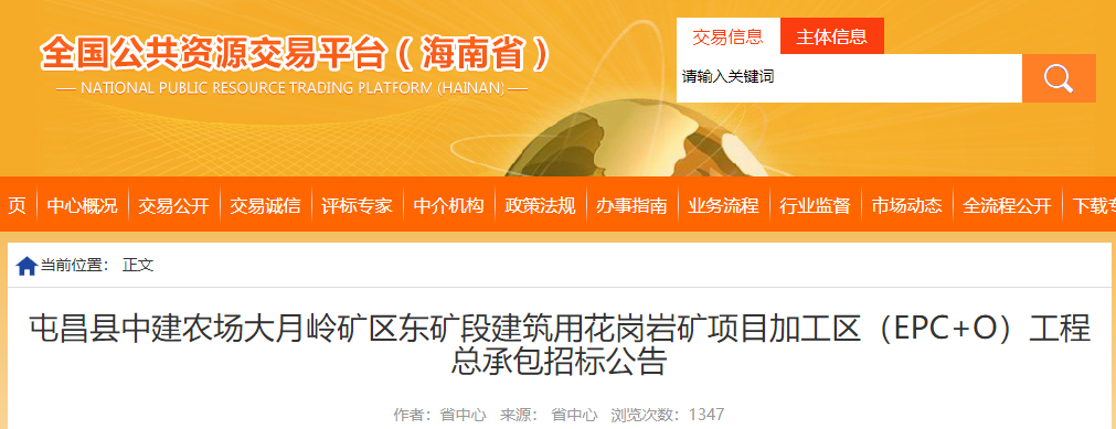 屯昌縣中建農場大月嶺礦區東礦段建筑用花崗巖礦項目加工區(EPC+O)工程總承包招標公告