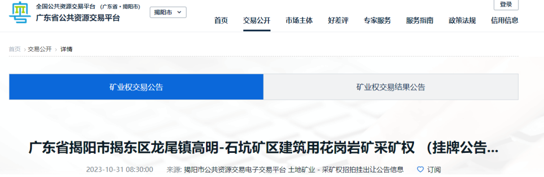 項目名稱:廣東省揭陽市揭東區龍尾鎮高明-石坑礦區建筑用花崗巖礦采礦權;標的編號:揭東礦讓〔2023〕001號。