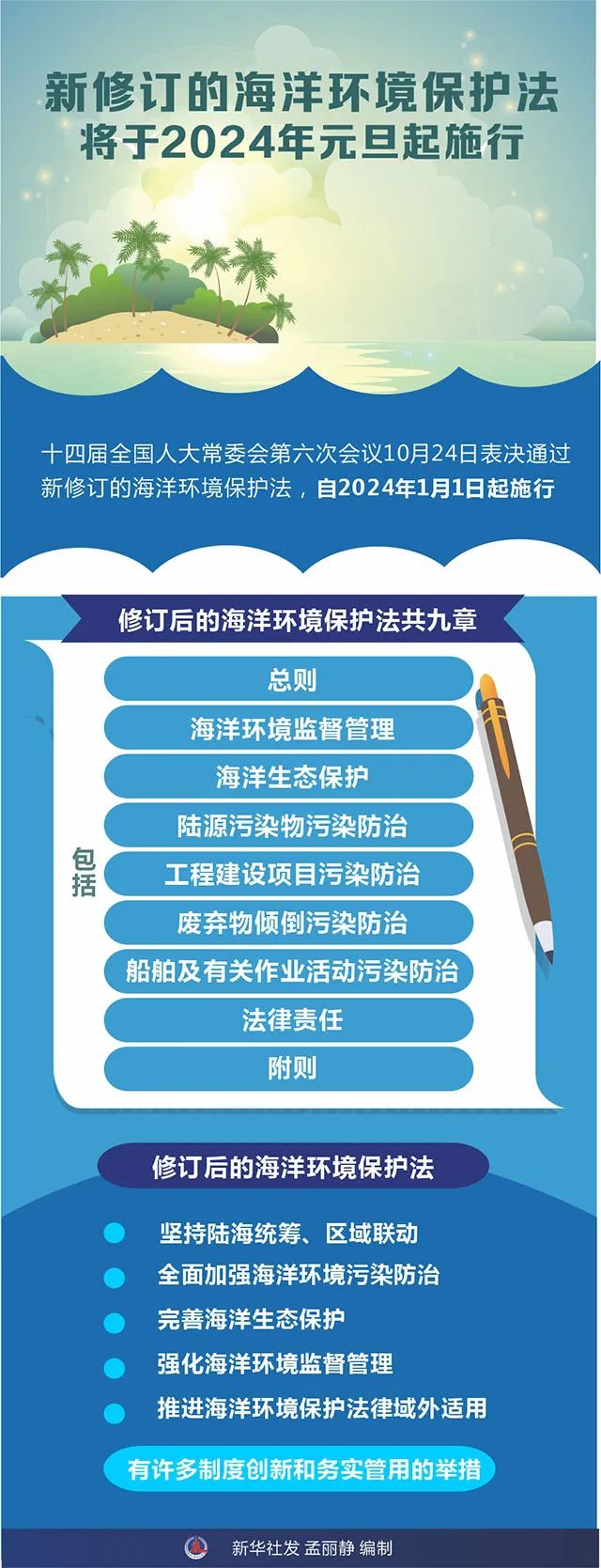 2023年10月24日,十四屆全國人大常委會第六次會議修訂通過《中華人民共和國海洋環(huán)境保護法》(以下簡稱《保護法》),國家主席習(xí)近平簽署主席令予以公布,自2024年1月1日起施行。