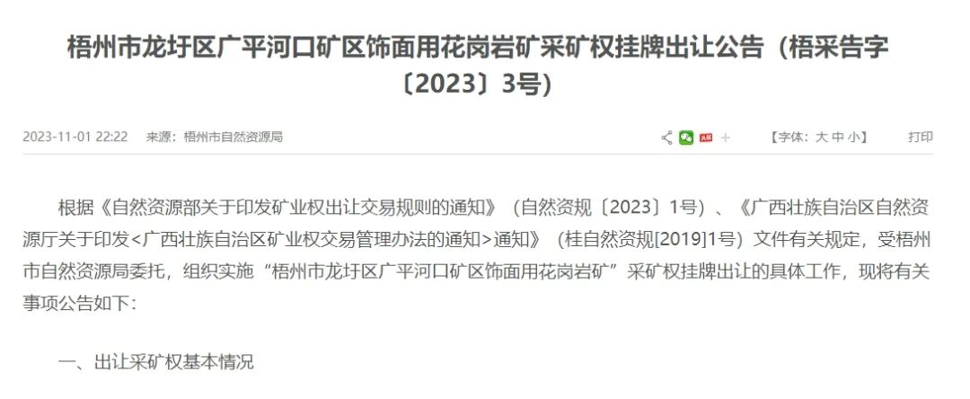 日前,廣西梧州又一大礦掛牌出讓。礦區范圍內建筑石料用礦約2億噸,設計年產約1020萬噸,出讓27年,掛牌起始價53200萬元。另外,此次采礦權出讓收益競得人可自愿一次性繳納或分期繳納。