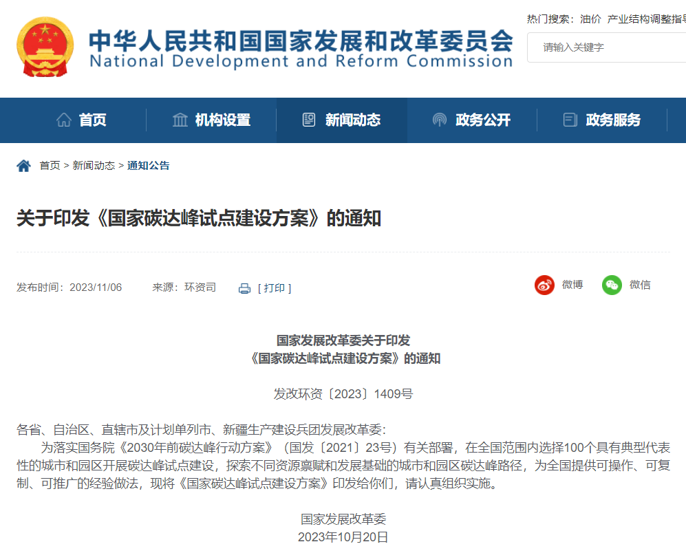 國家發(fā)展改革委有關(guān)負(fù)責(zé)同志就《國家碳達(dá)峰試點(diǎn)建設(shè)方案》答記者問近日,國家發(fā)展改革委印發(fā)了《國家碳達(dá)峰試點(diǎn)建設(shè)方案》(發(fā)改環(huán)資〔2023〕1409號(hào),以下簡稱《方案》)。《方案》提出將在全國范圍內(nèi)選擇100個(gè)具有典型代表性的城市和園區(qū)開展碳達(dá)峰試點(diǎn)建設(shè),聚焦破解綠色低碳發(fā)展面臨的瓶頸制約,探索不同資源稟賦和發(fā)展基礎(chǔ)的城市和園區(qū)碳達(dá)峰路徑,為全國提供可操作、可復(fù)制、可推廣的經(jīng)驗(yàn)做法。國家發(fā)展改革委有關(guān)負(fù)責(zé)同志就《方案》接受采訪,回答了記者提問。