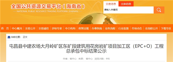 近日,中國(guó)葛洲壩集團(tuán)第三工程有限公司、中交天航南方交通建設(shè)有限公司、中國(guó)電建集團(tuán)西北勘測(cè)設(shè)計(jì)研究院有限公司聯(lián)合中標(biāo)海南屯昌縣中建農(nóng)場(chǎng)大月嶺礦區(qū)東礦段建筑用花崗巖礦項(xiàng)目加工區(qū)(EPC+O)工程總承包。中標(biāo)金額約4.5億元,總工期近1年。