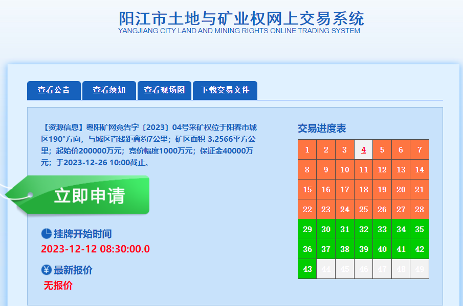 4、競買申請人須提供中華人民共和國境內銀行或其分支機構對競買申請人出具的人民幣100億元(含)以上的銀行流水證明(掛牌報價之日前1年內流水);或提供競買申請人在中華人民共和國境內銀行或其分支機構存款余額為人民幣300000萬元(含)以上的存款證明文件(掛牌報價之日起1年內有效)三、本次采礦權網上競價方式出讓按照價高者得原則確定競得人四、申請人可于2023年12月12日8時30分至2023年12月25日16時前,競買申請人可通過互聯網登錄陽江市土地與礦業權網上交易系統(https://jy.yjggzy.cn:8087/)或廣東省公共資源交易平臺交易系統(https://ygp.gdzwfw.gov.cn/ggzy-portal/#/441700/jyxt)申請參加競買,交納競買保證金到賬截止時間為2023年12月25日16時0分請錄網上交易系統詳閱“應用指南”悉知相關的網上交易程、保證金繳納等操作方法。